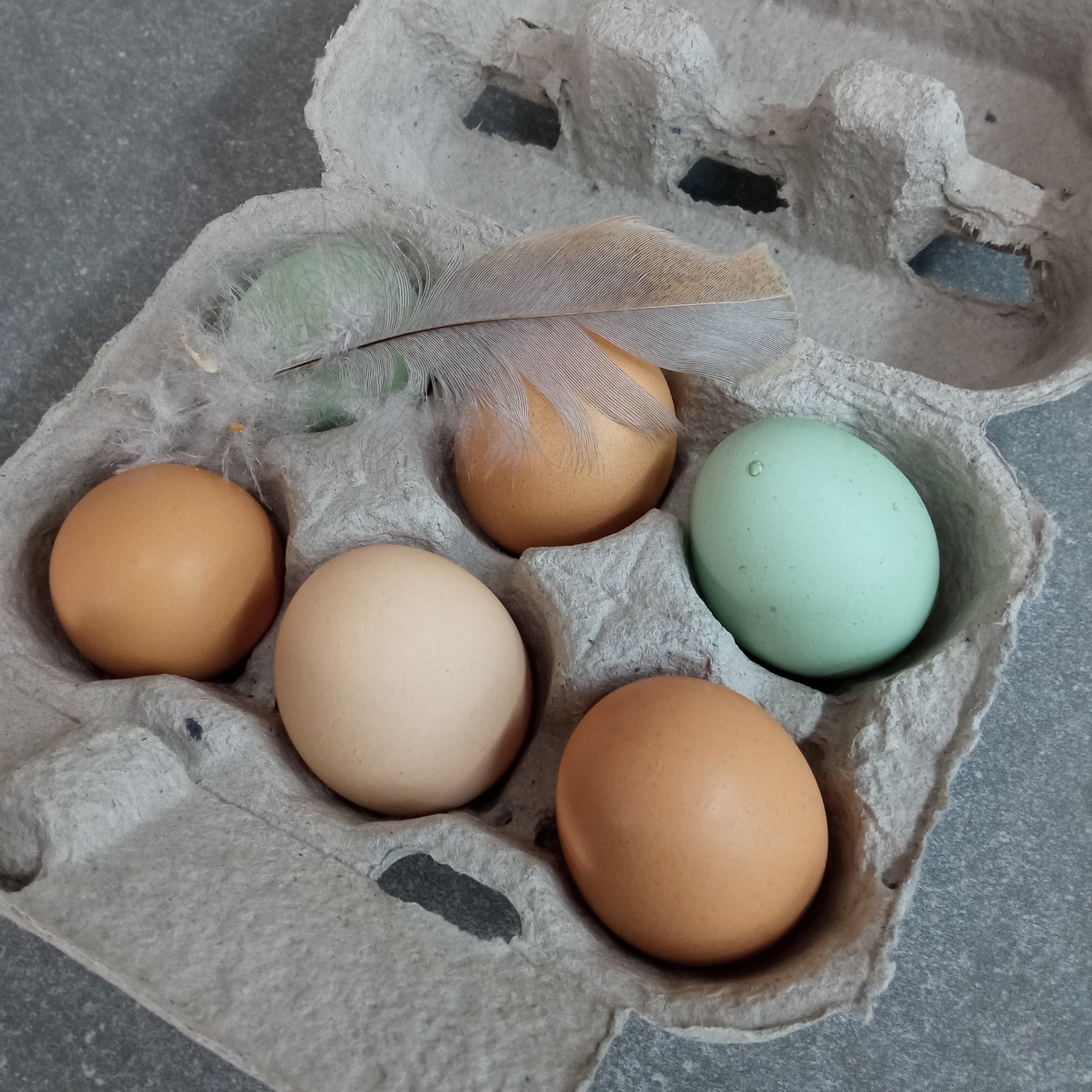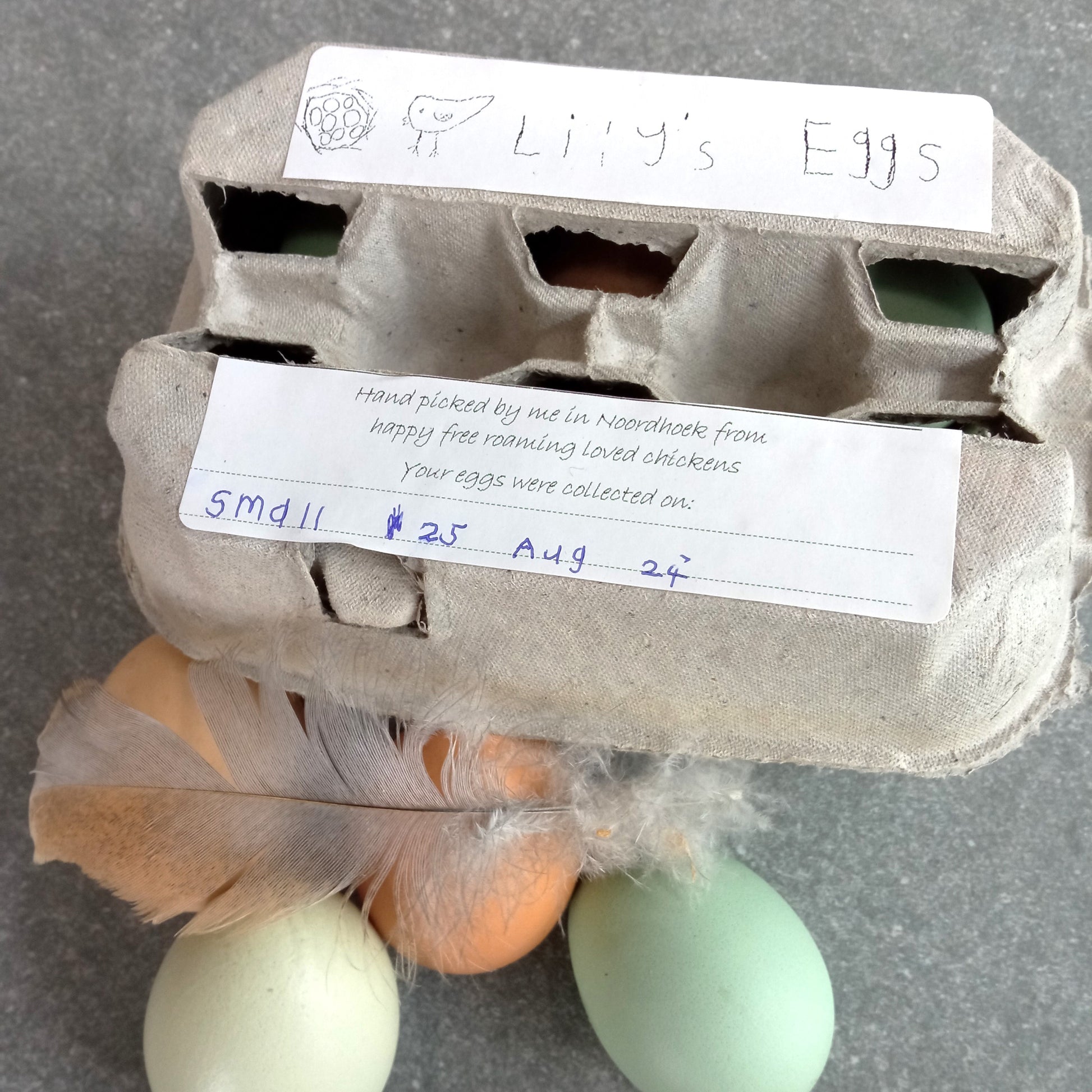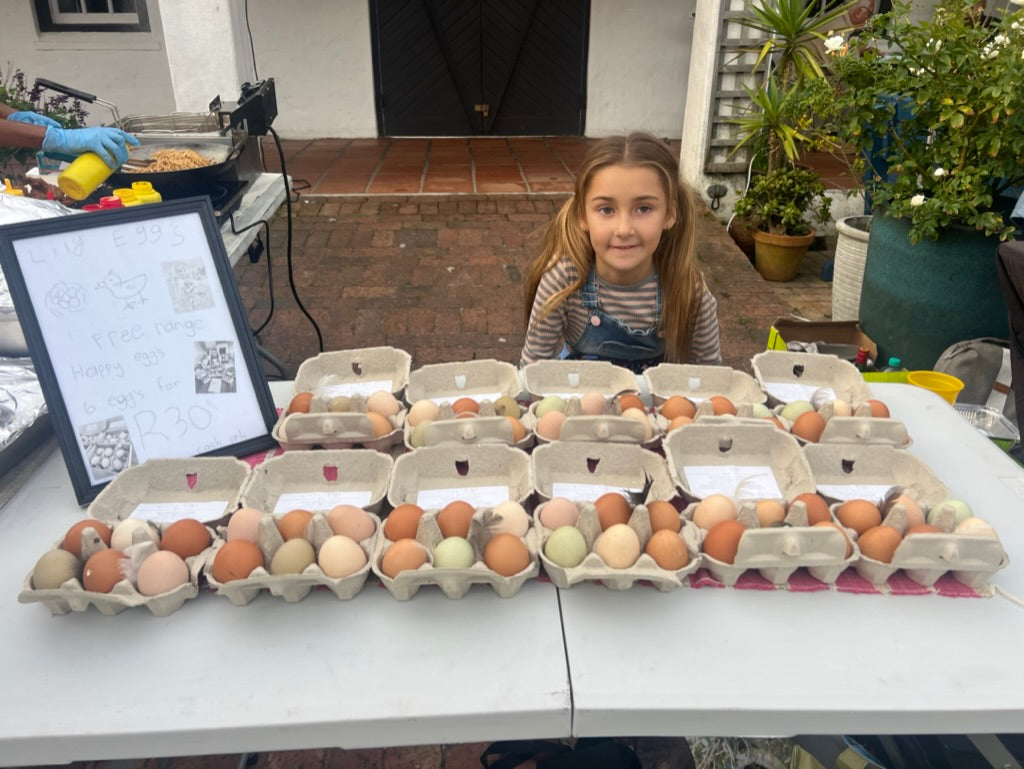 These fresh farm eggs were laid by our happy free roaming chickens and collected by hand by my daughter, Lily, at our small holding in Noordhoek.
